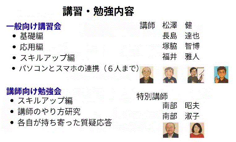 スマホの基本    LINEの応用編 梅雨の天気と防災  カメラと写真   AIで「調べる・考える・文章を作る」を体験する   地図・お出かけ